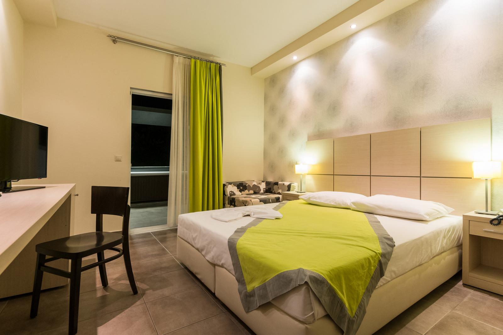 Stylish double room with private balcony and modern amenities, ideal for a peaceful and comfortable island getaway.